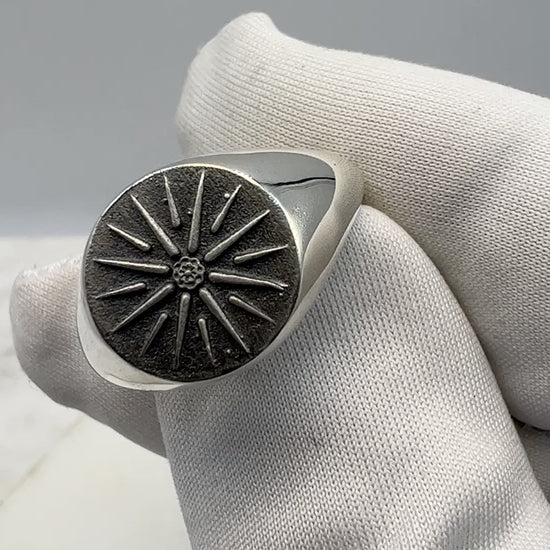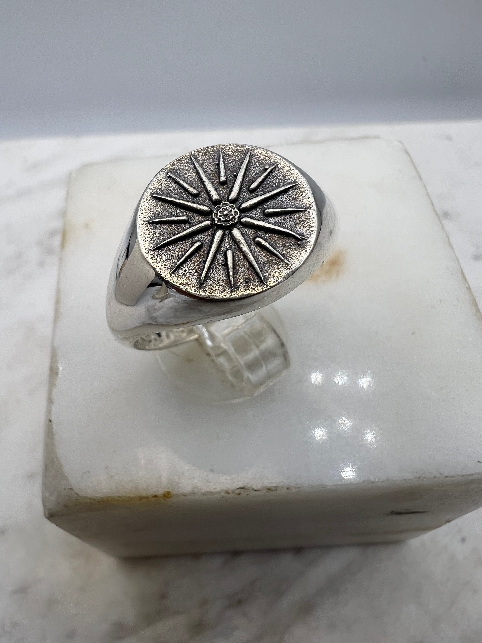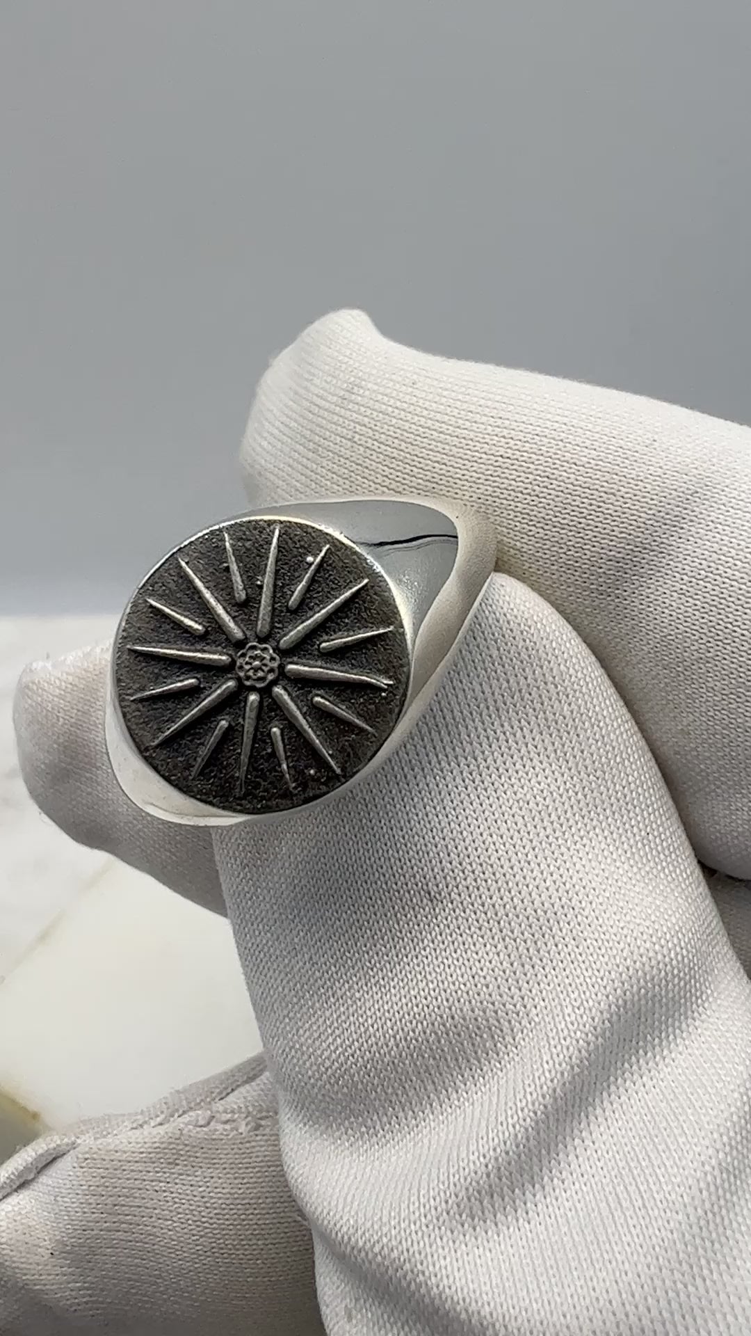 Beautiful in details ring inspired by the ancient Vergina sun Greek symbol. The design in the middle of the sun is a rosette flower which symbolizes beauty, purity, worship, fertilisation, earth and power according to ancient Greeks. A piece of history perfect for everyday jewelry or as a gift to a beloved person.