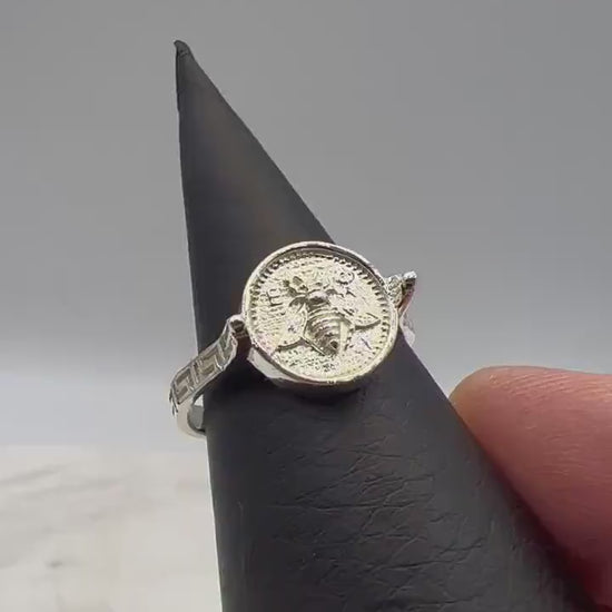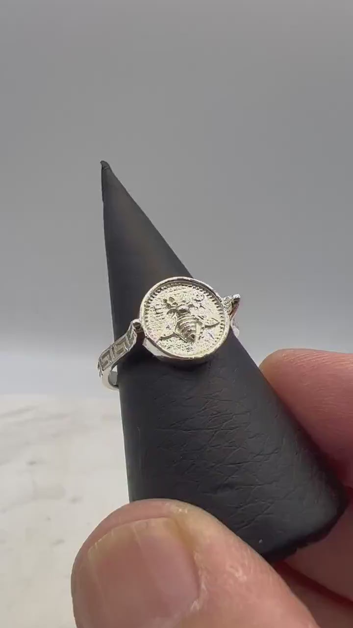 Greek Sacred Bee Artemis Goddess Medallion Coin Ring , Sterling silver bee ring bumble bee, honey bee signet ring MEANDROS